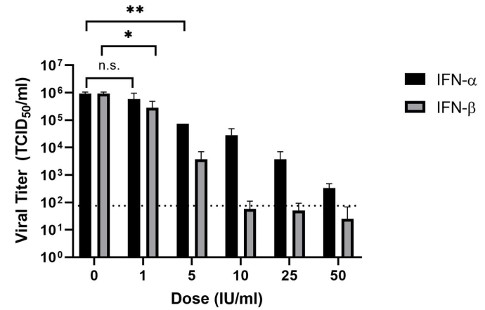 在該項(xiàng)研究中,在感染SARS-CoV-2的Vero細(xì)胞模型上,使用濃度僅為50 IU/ml的IFN-α即可使病毒滴度降低3.4-4 log值。IFN-α和IFN-β對(duì)SARS-CoV-2病毒的EC50分別是1.35 IU / ml和0.76IU /ml(圖1)。這些結(jié)果表明SARS-CoV-2比包括SARS-CoV在內(nèi)的許多其它病毒對(duì)人類I型干擾素(IFNα/β)更敏感,對(duì)COVID-19治療有參考意義。