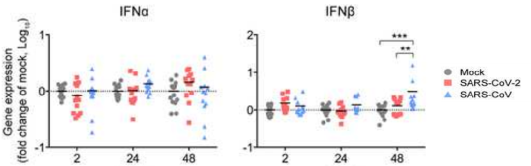 為什么SARS-CoV-2比SARS-CoV復(fù)制更快、病毒載量更高?4月11日,發(fā)表于《Clinical Infectious Diseases》的一項(xiàng)研究對(duì)該問題給出了解釋:新冠病毒對(duì)人體自身干擾素產(chǎn)生有更強(qiáng)的抑制作用【3】。在該研究中,香港大學(xué)及香港瑪麗醫(yī)院的研究人員利用離體培養(yǎng)的人體肺部組織為模型,對(duì)比SARS-CoV-2與SARS-CoV的感染情況,在48小時(shí)內(nèi),SARS-CoV-2從受感染的肺組織中產(chǎn)生的感染性病毒量是SARS-CoV產(chǎn)生的病毒量的3.2倍,SARS-CoV-2和SARS-CoV均抑制了感染的人肺組織中I型干擾素的表達(dá),且SARS-CoV-2的抑制更明顯(圖2),這顯示出SARS-CoV-2對(duì)先天免疫系統(tǒng)有較強(qiáng)的抑制作用。由于先天免疫系統(tǒng)是抵抗病毒的第一道防線,這種抑制作用使得SARS-CoV-2能夠在出現(xiàn)癥狀的早期能夠大量且快速地復(fù)制,且不易引起顯著的癥狀。