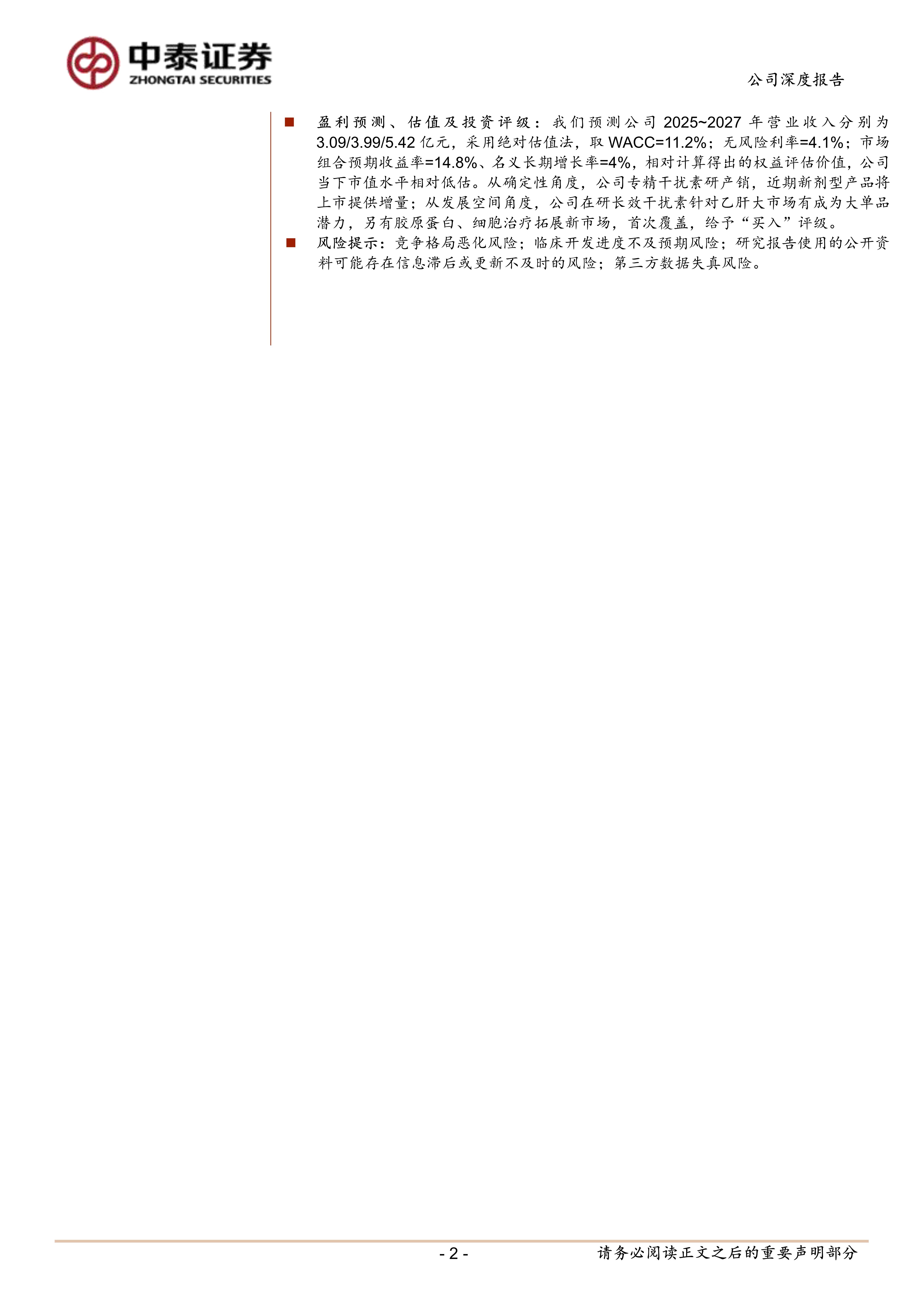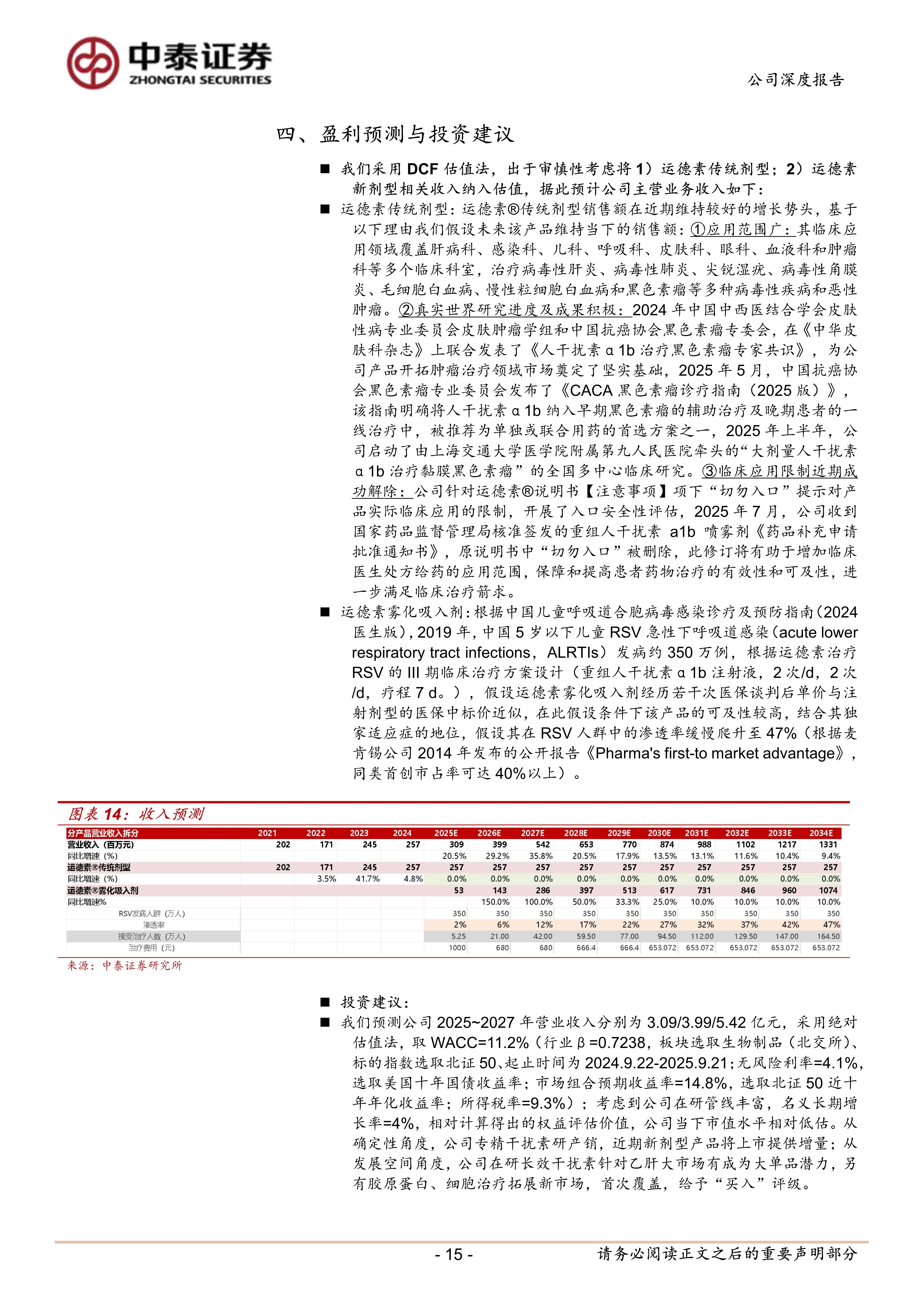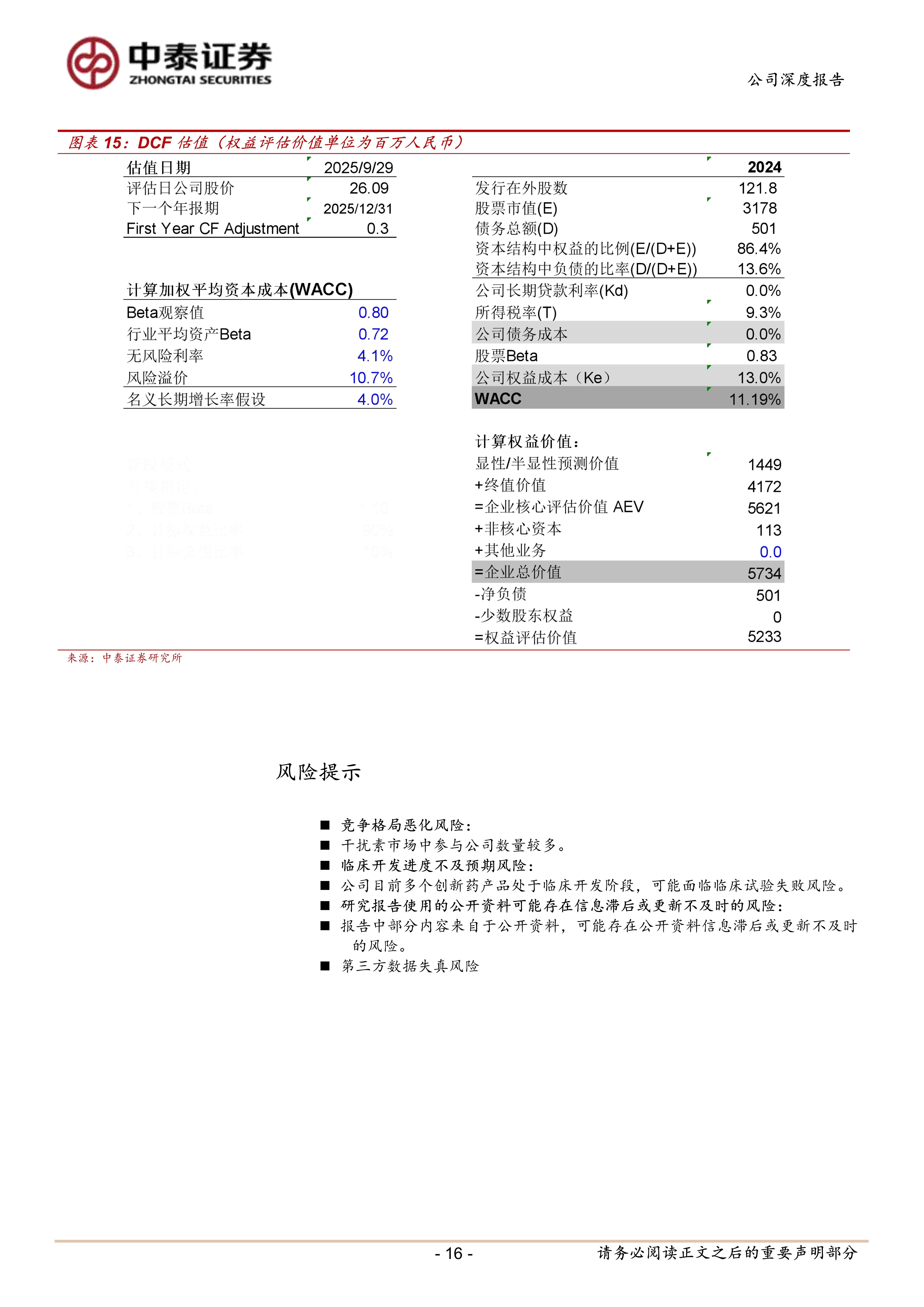 盈利預(yù)測(cè)、估值及投資評(píng)級(jí):我們預(yù)測(cè)公司2025~2027年?duì)I業(yè)收入分別為3.09/3.99/5.42億元,采用絕對(duì)估值法,取WACC=11.2%;無(wú)風(fēng)險(xiǎn)利率=4.1%;市場(chǎng)組合預(yù)期收益率=14.8%、名義長(zhǎng)期增長(zhǎng)率=4%,相對(duì)計(jì)算得出的權(quán)益評(píng)估價(jià)值,公司當(dāng)下市值水平相對(duì)低估。從確定性角度,公司專精干擾素研產(chǎn)銷,近期新劑型產(chǎn)品將上市提供增量;從發(fā)展空間角度,公司在研長(zhǎng)效干擾素針對(duì)乙肝大市場(chǎng)有成為大單品潛力,另有膠原蛋白、細(xì)胞治療拓展新市場(chǎng),首次覆蓋,給予“買(mǎi)入”評(píng)級(jí)。