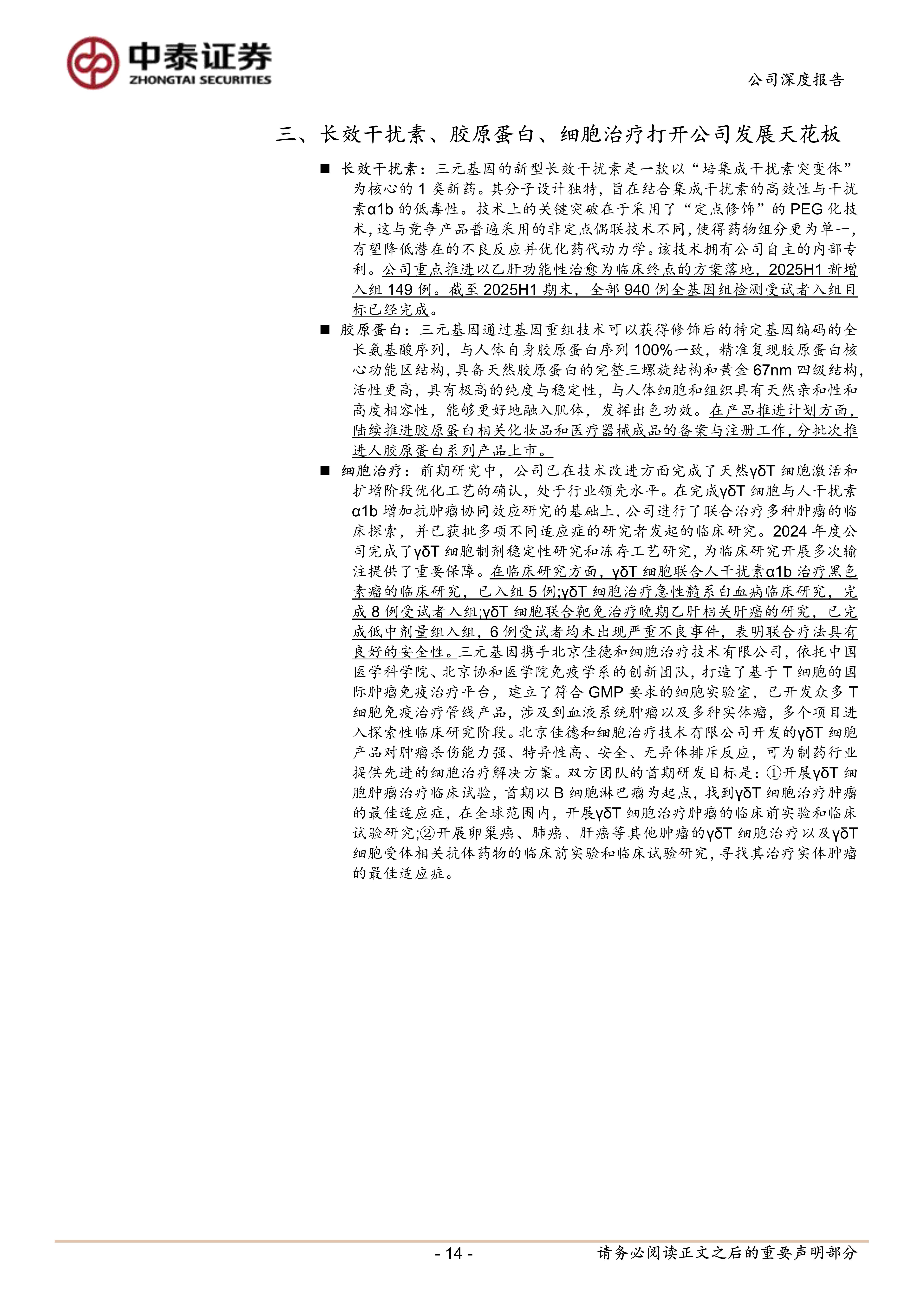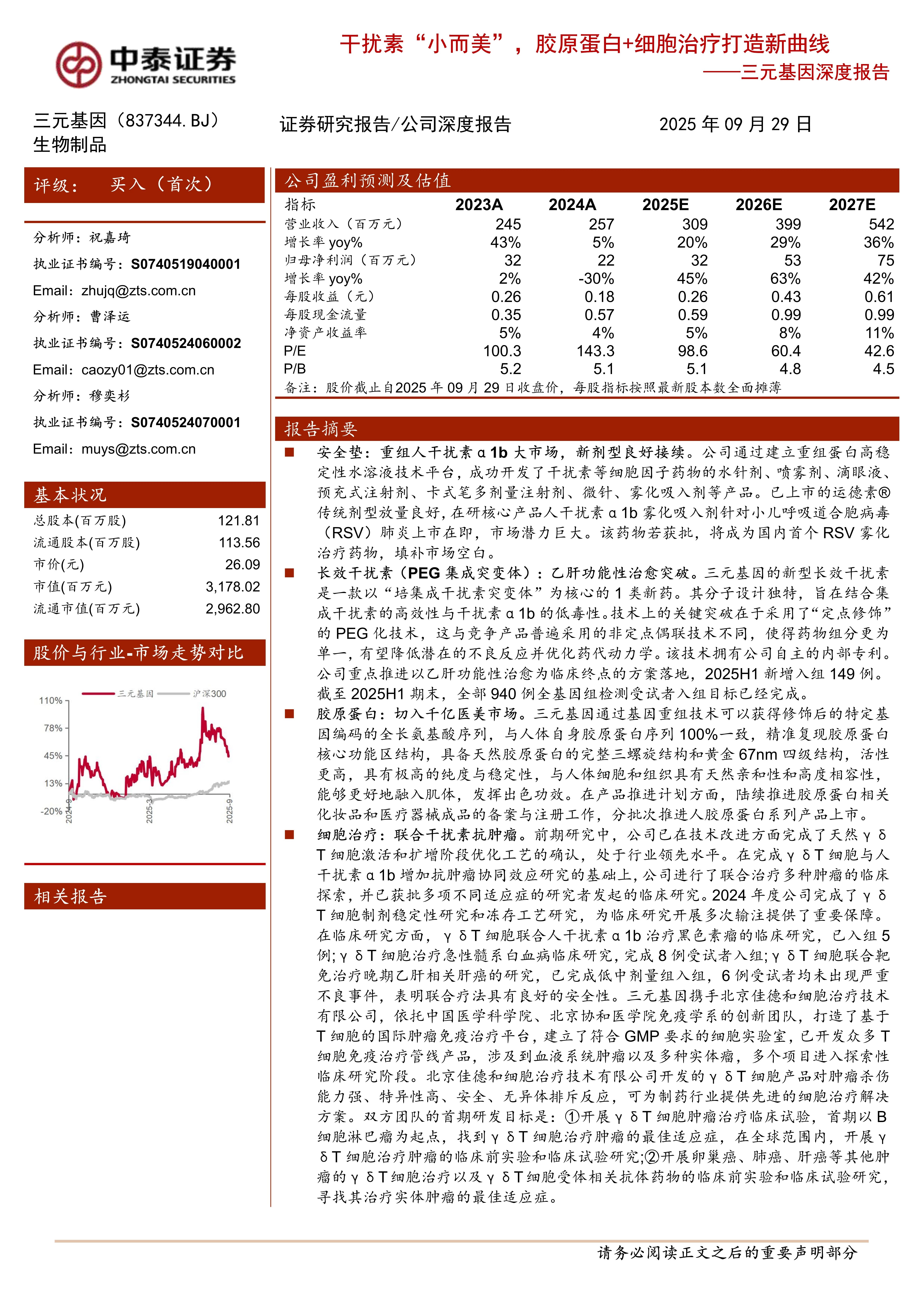 細(xì)胞治療:聯(lián)合干擾素抗腫瘤。前期研究中,公司已在技術(shù)改進(jìn)方面完成了天然γδT細(xì)胞激活和擴(kuò)增階段優(yōu)化工藝的確認(rèn),處于行業(yè)領(lǐng)先水平。在完成γδT細(xì)胞與人干擾素α1b增加抗腫瘤協(xié)同效應(yīng)研究的基礎(chǔ)上,公司進(jìn)行了聯(lián)合治療多種腫瘤的臨床探索,并已獲批多項(xiàng)不同適應(yīng)癥的研究者發(fā)起的臨床研究。2024年度公司完成了γδT細(xì)胞制劑穩(wěn)定性研究和凍存工藝研究,為臨床研究開(kāi)展多次輸注提供了重要保障。在臨床研究方面,γδT細(xì)胞聯(lián)合人干擾素α1b治療黑色素瘤的臨床研究,已入組5例;γδT細(xì)胞治療急性髓系白血病臨床研究,完成8例受試者入組;γδT細(xì)胞聯(lián)合靶免治療晚期乙肝相關(guān)肝癌的研究,已完成低中劑量組入組,6例受試者均未出現(xiàn)嚴(yán)重不良事件,表明聯(lián)合療法具有良好的安全性。三元基因攜手北京佳德和細(xì)胞治療技術(shù)有限公司,依托中國(guó)醫(yī)學(xué)科學(xué)院、北京協(xié)和醫(yī)學(xué)院免疫學(xué)系的創(chuàng)新團(tuán)隊(duì),打造了基于T細(xì)胞的國(guó)際腫瘤免疫治療平臺(tái),建立了符合GMP要求的細(xì)胞實(shí)驗(yàn)室,已開(kāi)發(fā)眾多T細(xì)胞免疫治療管線產(chǎn)品,涉及到血液系統(tǒng)腫瘤以及多種實(shí)體瘤,多個(gè)項(xiàng)目進(jìn)入探索性臨床研究階段。北京佳德和細(xì)胞治療技術(shù)有限公司開(kāi)發(fā)的γδT細(xì)胞產(chǎn)品對(duì)腫瘤殺傷能力強(qiáng)、特異性高、安全、無(wú)異體排斥反應(yīng),可為制藥行業(yè)提供先進(jìn)的細(xì)胞治療解決方案。雙方團(tuán)隊(duì)的首期研發(fā)目標(biāo)是:①開(kāi)展γδT細(xì)胞腫瘤治療臨床試驗(yàn),首期以B細(xì)胞淋巴瘤為起點(diǎn),找到γδT細(xì)胞治療腫瘤的最佳適應(yīng)癥,在全球范圍內(nèi),開(kāi)展γδT細(xì)胞治療腫瘤的臨床前實(shí)驗(yàn)和臨床試驗(yàn)研究;②開(kāi)展卵巢癌、肺癌、肝癌等其他腫瘤的γδT細(xì)胞治療以及γδT細(xì)胞受體相關(guān)抗體藥物的臨床前實(shí)驗(yàn)和臨床試驗(yàn)研究,尋找其治療實(shí)體腫瘤的最佳適應(yīng)癥。