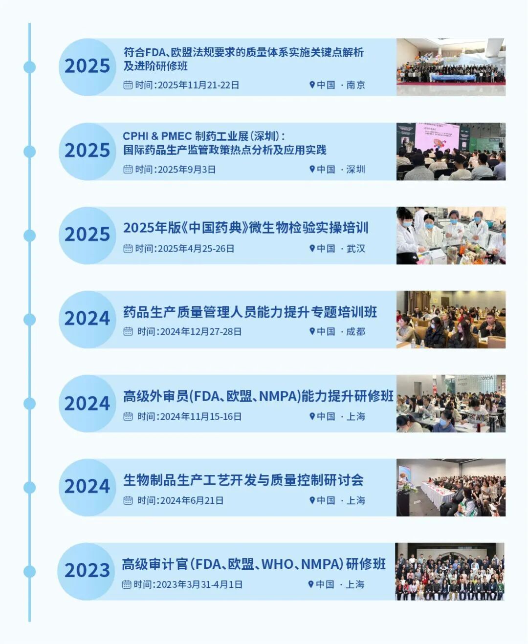 為滿足全國更多制藥企業(yè)的學(xué)習(xí)需求,本系列“符合FDA、歐盟法規(guī)要求的質(zhì)量體系實(shí)施關(guān)鍵點(diǎn)解析及進(jìn)階研修班”將于近期相繼在上海和廣州開班,持續(xù)為中國制藥行業(yè)的質(zhì)量管理與國際化發(fā)展注入專業(yè)動(dòng)力。
