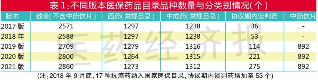 如表1,醫(yī)保藥品目錄品種數量持續(xù)增長,其中更多為談判品種的增加。