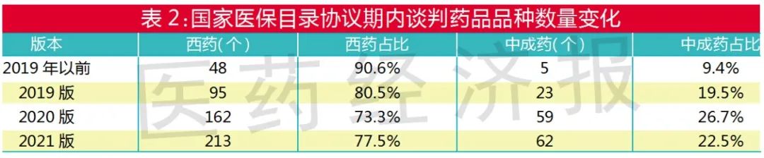 談判品種中,西藥品種占大頭。2019年以前,中成藥談判品種僅5個,西藥品種數量占談判目錄品種數量的90%以上;后來,中成藥談判品種數量有所增加,至2021年,中成藥占比約22.5%。