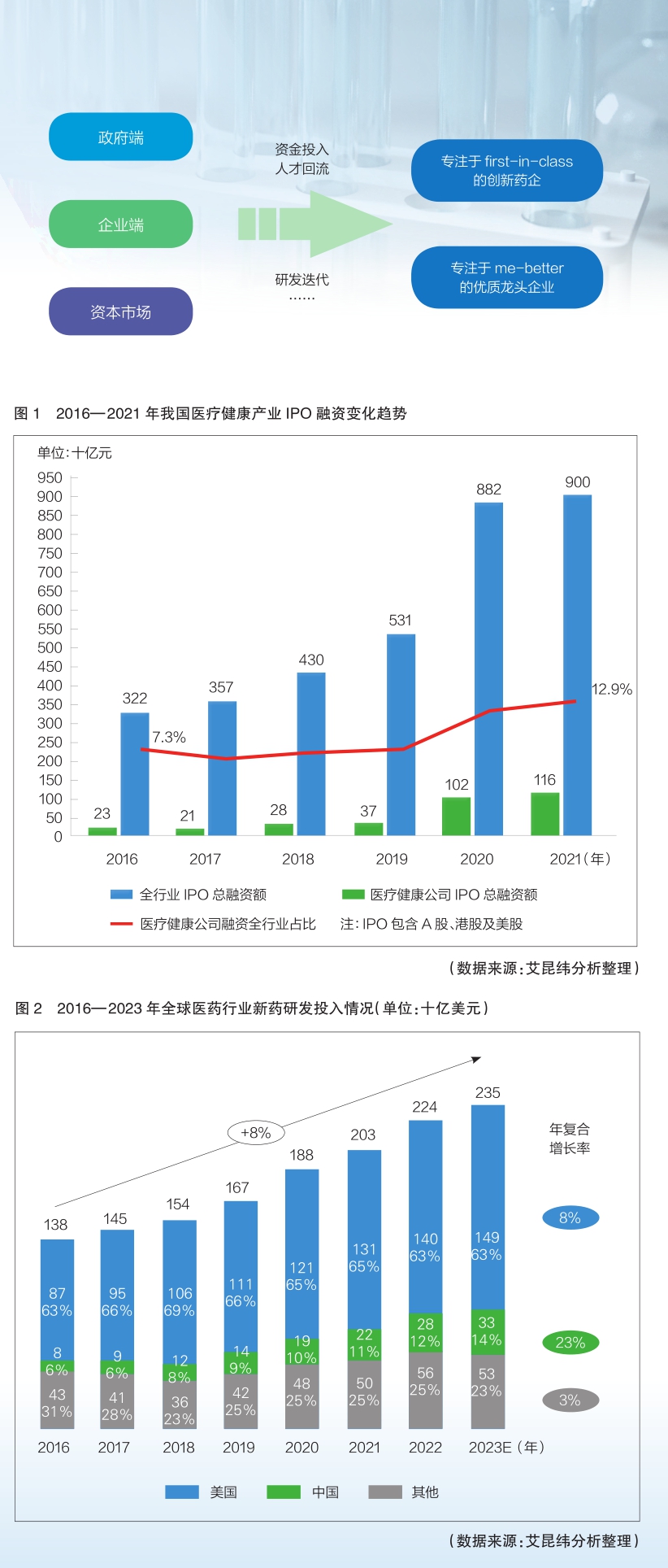 自2015年藥品審評審批制度改革以來,我國醫(yī)藥創(chuàng)新政策環(huán)境明顯改善。2018年港股“18A”上市新規(guī)及2019年上交所科創(chuàng)板的推出,極大豐富了生物醫(yī)藥投資退出渠道,快速推高了資本市場對生物醫(yī)藥的投資熱情。據(jù)艾昆緯統(tǒng)計(jì)分析,2021年生物醫(yī)藥整體融資額(一級市場+IPO)較2017年增長近3.5倍(醫(yī)療健康產(chǎn)業(yè)IPO融資變化情況詳見圖1)。但受到監(jiān)管政策趨嚴(yán)、國際環(huán)境變化、新冠肺炎疫情反復(fù)等因素影響,自2021年四季度起,我國生物醫(yī)藥融資急劇放緩,生物醫(yī)藥企業(yè)一、二級市場表現(xiàn)持續(xù)低迷。那么,我國生物醫(yī)藥投資是否已見頂?未來五年投資前景如何?