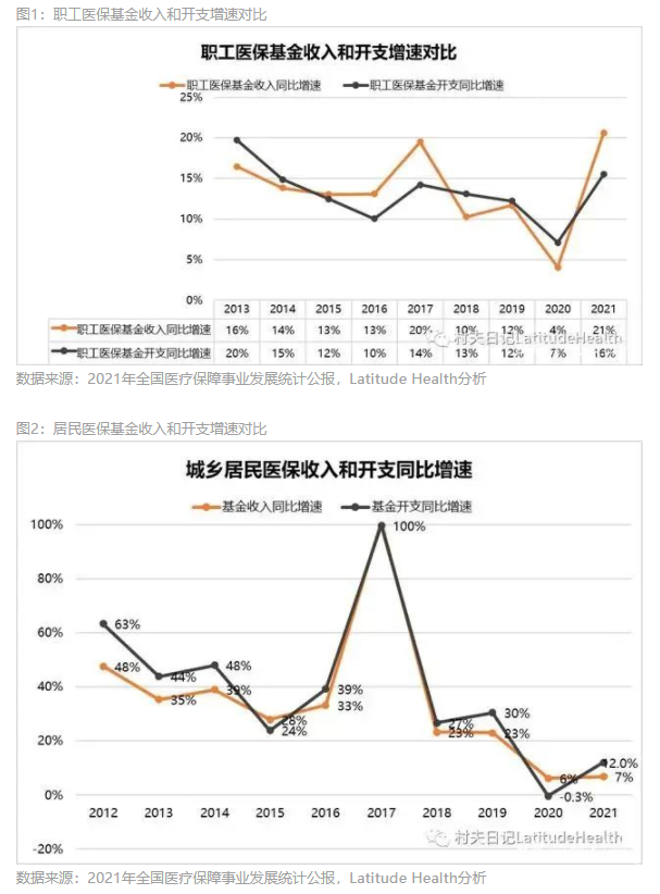如果從基金收入和開支增速對比來看,職工醫(yī)保在2021年扭轉(zhuǎn)了自從2018年以來的不利局面,在連續(xù)3年的開支增速超過收入增速之后,變?yōu)槭杖朐鏊俪^開支增速。但居民醫(yī)保僅是在2020年出現(xiàn)了收入增速超過開支增速,2021年延續(xù)之前的趨勢,開支增速大幅超過收入增速。這說明職工醫(yī)保開源能力加強(qiáng),尤其是通過持續(xù)納入類似靈活就業(yè)的參保人員方面。