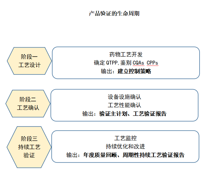 從產(chǎn)品驗證的生命周期來講,可以分為三個階段,工藝設(shè)計、工藝確認(rèn)、持續(xù)工藝驗證,如下圖所示。