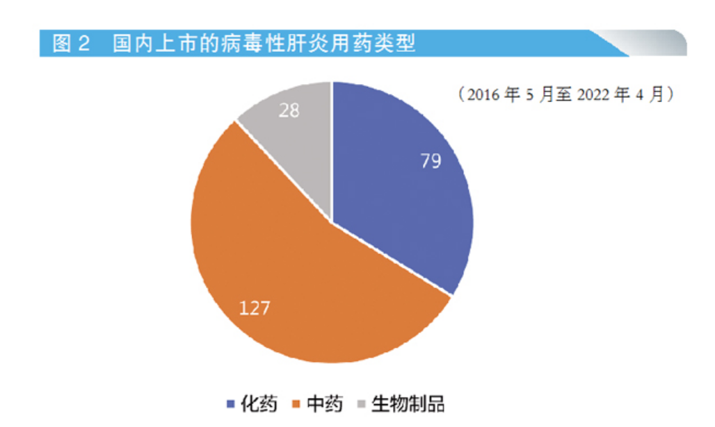 從起效機(jī)制來(lái)看,我國(guó)現(xiàn)有用于臨床治療病毒性肝炎的藥物主要有抗病毒藥物、抗炎保肝藥物、抗硬化藥物和輔助藥物等。由藥智網(wǎng)上市藥品數(shù)據(jù)可知,自世衛(wèi)組織于2016年5月設(shè)定“2030目標(biāo)”至今年4月底,國(guó)內(nèi)上市的抗病毒性肝炎藥物中,中藥品種有127個(gè)(54%),化藥有79個(gè)(34%),生物制品有28個(gè)(12%),現(xiàn)有藥品類(lèi)型存量差異較大。多數(shù)中藥只能作為抗病毒藥物的輔助用藥,無(wú)法單藥治療;生物制品多為疫苗品種,并非治療用藥。而化藥是我國(guó)目前病毒性肝炎用藥市場(chǎng)最大的缺口。
