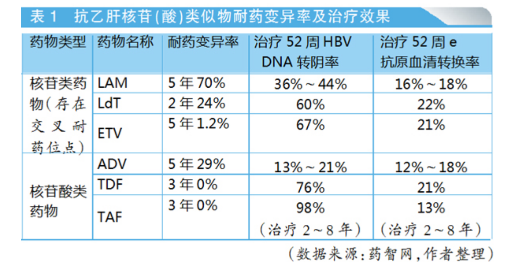目前臨床在用的口服抗病毒藥物均屬于核苷(酸)類(lèi)藥物(NAs)。耐藥變異是核苷類(lèi)藥物的共性,不管是藥效較好的恩替卡韋(ETV)、替諾福韋(TDF),藥效偏弱的拉米夫定(LAM)、替比夫定(LdT)或阿德福韋(ADV),還是目前暫無(wú)臨床耐藥報(bào)道的二代替諾福韋(TAF),其過(guò)量或長(zhǎng)期使用均會(huì)產(chǎn)生不同程度的耐藥問(wèn)題。