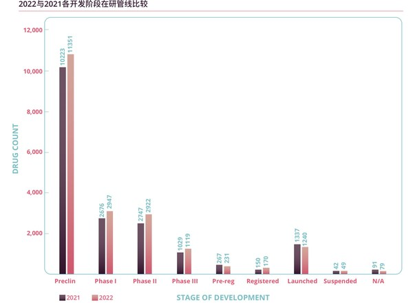 圖2 2021年與2022年各開發(fā)階段在研管線比較(Informa Pharmaprojects, 2022年1月)