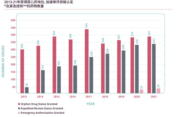 圖3 2013-2021年獲得孤兒藥地位、加速審評(píng)資格認(rèn)定及緊急授權(quán)的藥物數(shù)量(Informa Pharmaprojects, 2022年1月)