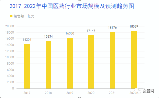 近年來,隨著經(jīng)濟(jì)不斷發(fā)展、人們可支配收入不斷增加、老齡化及政策驅(qū)動等因素,我國醫(yī)藥行業(yè)進(jìn)入快速發(fā)展階段,2017-2019年間,市場規(guī)模從14304億元增長至16330億元,2020年由于新冠疫情的全面爆發(fā),行業(yè)規(guī)模出現(xiàn)收縮,下降至14480億元,2021年,隨著疫情常態(tài)化,行業(yè)規(guī)模快速回升,市場規(guī)模達(dá)到18176億元。2022年中國醫(yī)藥行業(yè)市場規(guī)模持續(xù)擴(kuò)大,預(yù)計達(dá)到18539億元。