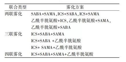 在我國常用ICS有布地奈德、丙酸倍氯米松和丙酸氟替卡松,SABA有沙丁胺醇和特布他林,SAMA有異丙托溴銨及其復合制劑,祛痰藥有乙酰半胱氨酸,抗感染藥物如僅有部分廠家的注射用兩性霉素B被批準用于霧化吸入治療嚴重的系統(tǒng)性真菌感染等,其余藥物國內(nèi)目前無專用霧化吸入制劑,下圖為臨床常用霧化吸入聯(lián)合方案: