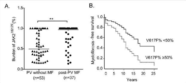 近年來(lái)研究統(tǒng)計(jì)表明,PV 患者最常見(jiàn)的基因突變是 JAK2-V617F,下圖所示一項(xiàng)研究中,入組 272 例中國(guó) JAK2 突變PV患者的研究結(jié)果表明(圖 1),骨髓纖維化患者中的中位 JAK2 突變負(fù)荷比無(wú)骨髓纖維化的PV患者的明顯更高,意味著 JAK2 突變負(fù)荷與骨髓纖維化的進(jìn)展程度和更嚴(yán)重的脾腫大、更嚴(yán)重的白細(xì)胞增高相關(guān)。并且研究發(fā)現(xiàn)造血干細(xì)胞移植六月后,JAK2 突變陽(yáng)性的 PV 患者的復(fù)發(fā)率明顯高于 JAK2 突變陰性的患者復(fù)發(fā)率。由此提示,對(duì)于 PV 患者,更應(yīng)重視基因突變負(fù)荷,用以指導(dǎo)治療方案的選擇。