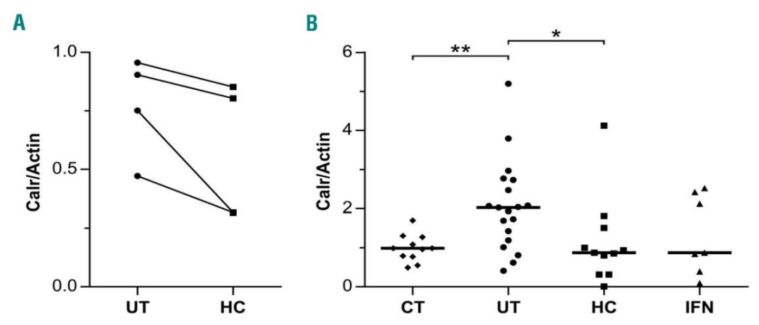 細(xì)胞膜蛋白的研究表明,羥基脲和干擾素 α 影響真性紅細(xì)胞增多癥紅細(xì)胞黏附和膜蛋白表達(dá)(圖 2)。使用羥基尿素(HC)和干擾素 α(IFNα)治療后,PV 患者的鈣網(wǎng)蛋白表達(dá)顯著降低。