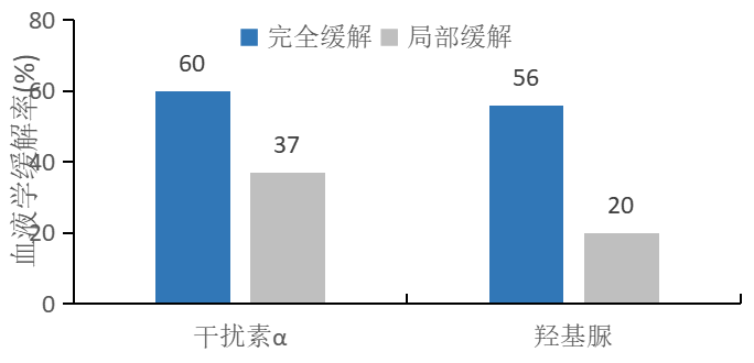 干擾素 α 具有綜合性的抗腫瘤作用機(jī)制,可用于多種骨髓增殖性腫瘤的治療,在治療 MPN 類(lèi)疾病中,仍然處于一線(xiàn)治療的位置,長(zhǎng)期治療有望獲得細(xì)胞遺傳學(xué)和分子遺傳學(xué)深度緩解。PV 治療中,羥基脲或干擾素 α(IFNα)為任何年齡 PV 患者降細(xì)胞治療的一線(xiàn)藥物。早期運(yùn)用干擾素 α 促進(jìn)臨床和細(xì)胞學(xué)緩解。