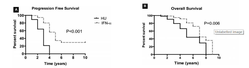 IFNα 治療 PV 在內(nèi)的 MPN,患者疾病無(wú)進(jìn)展生存率以及整體生存率更高,IFNα 與羥基脲治療患者的疾病無(wú)進(jìn)展生存中位時(shí)間(IFN-α 和羥基脲組分別為 5.0 年和 3.1 年)(P<0.001)(圖 4A)和整體生存中位時(shí)間(IFN-α 和羥基脲組的 7.8 年vs 5.8 年)(P=0.006) (圖 4B)均有顯著改善。