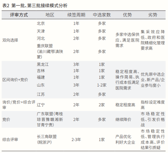 各地不同模式的設(shè)計均體現(xiàn)出接續(xù)階段的初衷,或重穩(wěn)定市場、醫(yī)院、價格,或?qū)刹糠纸Y(jié)果不滿借機(jī)優(yōu)化,或進(jìn)一步擠壓價格水分。從穩(wěn)定市場層面,四種模式穩(wěn)定程度從高到低依次為詢價續(xù)約模式、雙向選擇帶量分配、綜合評價、完全競價?;诓煌慕永m(xù)目的,各模式均展現(xiàn)出優(yōu)劣勢(見表2)。