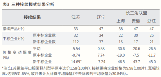 以江蘇(區(qū)間詢價+競價)、遼寧(詢價/競價+綜合評審)、長三角聯(lián)盟(綜合評審)這三種模式進(jìn)行第一批、第三批接續(xù)結(jié)果的分析(見表3),具體情況如下。